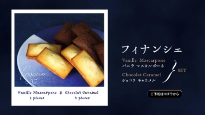 2種類の特別なフィナンシェ。マダガスカル産のバニラとマスカルポーネチーズを生地に加えたバニラの風味がリッチな「バニラ マスカルポーネ」と、フランス産のココアパウダーにカカオマスを加え、仕上げにカカオニブをトッピングした「ショコラ キャラメル」を各種4個づつ計8個入りのセットでの販売です。